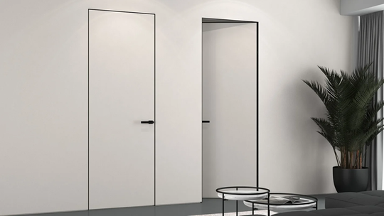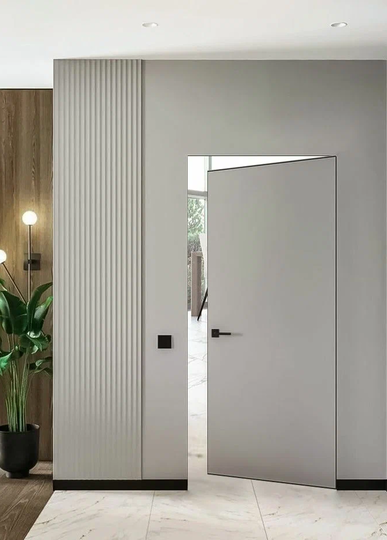 Скрытая дверь обратного открывания Инвизибл под покраску в скрытом коробе. Грунтованное покрытие для дальнейшего декорирования краской. Допустимо использование в помещениях с повышенной влажностью. Безопасно для здоровья и окружающей среды. Можно красить или клеить обои. Устанавливается вровень со стеной.