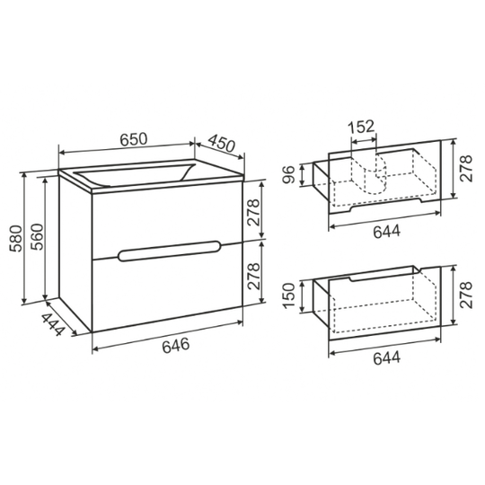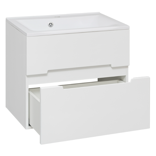 Тумба Olivia 65 оснащена двумя выдвижными ящиками на шариковых направляющих скрытого монтажа с доводчиками. Ящики легко открываются благодаря удобным вырезам на фасаде.