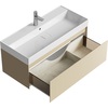 Тумба Aqwella Geometria 100 оснащена одним выдвижным ящиком на направляющих скрытого монтажа, что обеспечивает плавное скольжение и мягкое закрывание. Фасады и боковины с обработкой торцов под углом 45 градусов создают лаконичность и изящный, почти монолитный силуэт в закрытом состоянии. Все грани имеют округлую фрезеровку, обеспечивая приятные тактильные ощущения при открывании. Внутри ящиков - отделка под светлый камень, боковины выполнены из толстого тонированного стекла, что добавляет коллекции элегантности.